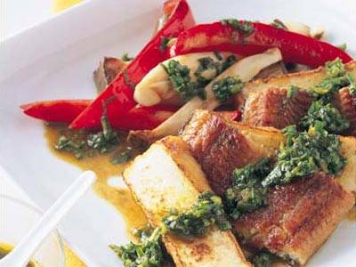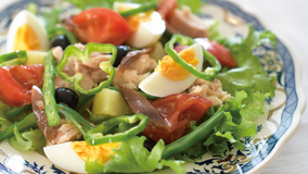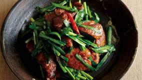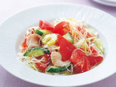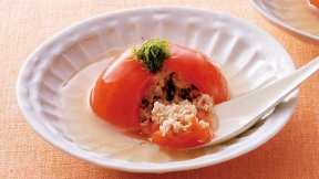 魚介、トマトのうまみに干しえびも加わった、味わい豊かなスープです。クレソンはフレッシュ感を残し、「ごま砂糖塩」をつけておひたし感覚で。