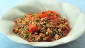 豚ひき肉に豆板醤を加えて、ピリッとアクセントのあるボリュームおかずに。底が広いフライパンで煮れば、煮くずれしやすいかぼちゃも形を保ってきれいに仕上がります。