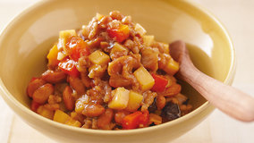 豚ひき肉に豆板醤を加えて、ピリッとアクセントのあるボリュームおかずに。底が広いフライパンで煮れば、煮くずれしやすいかぼちゃも形を保ってきれいに仕上がります。