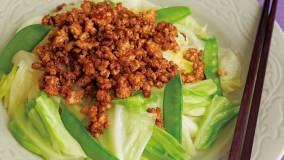 れんこんと水菜のシャキシャキ食感が楽しいボリュームのあるホットサラダ。ドレッシングがわりの肉みそが、ご飯にもよく合うおいしさ!