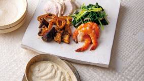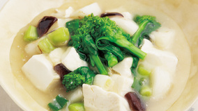 豆腐と豆乳を使った、白くなめらかなクリームが主役!鶏肉やえび、野菜などをあえていただく、温かい白あえです。季節の食材を使えば、一年中楽しめるあえ物です。