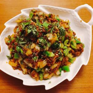 たまたま材料があったのでほぼレシピ通りに作りました。材料を切りそろえたら、あとは一瞬、10分もかかってないと思います。タマネギ、ピーマンはまだシャキシャキするくらいが美味しい!家族にも大好評でした。