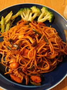 野菜とケチャップをしっかり焼き付ける作業が本当に重要だと実感しました。最後に絡めるバターもいい風味とコクが足されて、途中で飽きることがなかったです。リピ決定です。一般的な1.6mmのスパゲッティを使いましたが太めの方が美味しいかも?ちなみにグリーンピースではなくピーマン入れました。