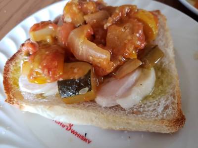 食パンに鶏ハム、ラタトゥイユ、オリーブオイル。ラタトゥイユとニョッキでグラタン。ラタトゥイユであれこれ展開して一鍋を母と二人で食べきりました。