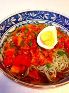 トマトとキムチでつゆがとっても美味しいです!おそばに合いますね。よく冷やすとより美味しいと思います。次は固ゆで卵じゃなくて温玉で!