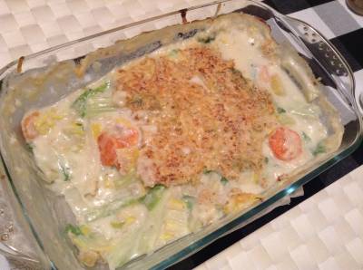 期待以上に美味しかったです。鶏肉と玉ねぎのマカロニグラタンよりホワイトソースがなんだかもっとコクがあるように感じました。白菜とタラのおかげでしょうか。材料は少しアレンジ。玉ねぎをリークに変更、冷蔵庫に人参が半分残っていたので一緒に使いました。白菜を煮込む時とオーブンに入れてからも白菜から水分が出てくると思ったので、牛乳を加える時ホワイトソースの固さの様子を見ながら分量を加減しました。結局テキストより少ない分量で投入を止めました。それでもホワイトソースの仕上がりはちょっとゆるめでした。でもそれが美味しかった。