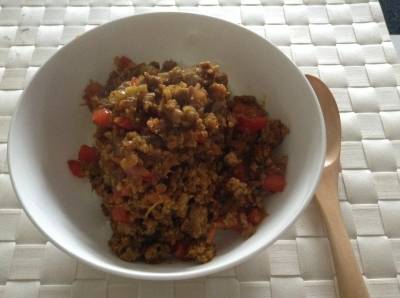 牛ひき肉がちょっと高かったので、豚ひき肉に変更。ピーマンも赤ピーマンに、余ったら冷凍しようと思って倍量で作りましたが、パートナーが美味しいと言って沢山おかわりしてしまったので、やっと明日のランチ分が残っただけでした。皆さんのアドバイスを参考にお肉と野菜の水分が飛ぶまで炒めました。カレー粉のスパイシー、ソフリットの旨味とケチャップとウスターソースの旨味が融合して美味しいです。温泉卵を添えても合うなーと思いました。次回やってみようと思います。
