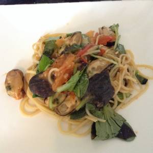 このレシピからアレンジしました。ムール貝を加えて、バジルがなかったので、代わりにサラダ用の葉物をお皿にサーブする直前に加えて、軽く混ぜました。にんにくの香ばしさが効いていてとても美味しかったので、にんにくを香ばしく炒めるのがポイントだと思いました。次回はレシピ通りにシンプルに作ってみます。