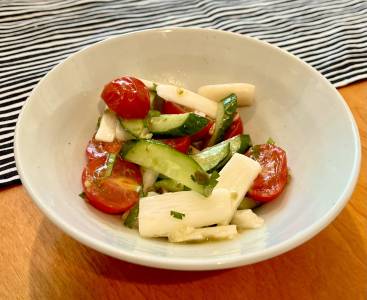 さっぱり爽やかなサラダ。エリンギは皆さんのコメントを参考にきっちり作業したらちょうどよかったです。チーズやベーコンを入れてパンチを出してもよいですね。