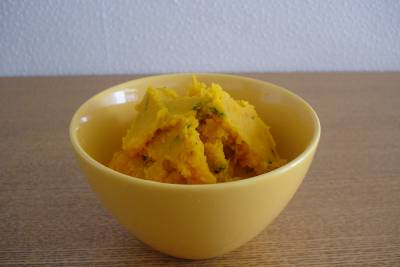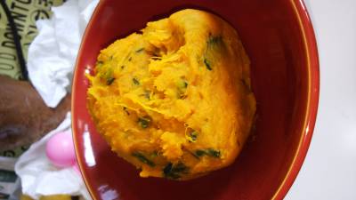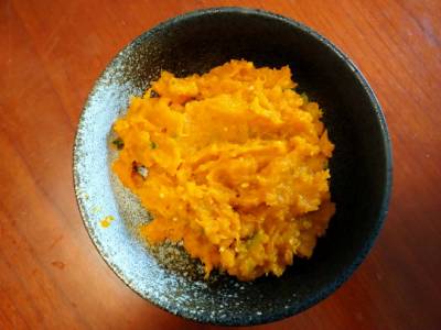 かぼちゃは種とワタを除いてラップで包み、電子レンジ(500W)に3~5分間、柔らかくなるまでかける。