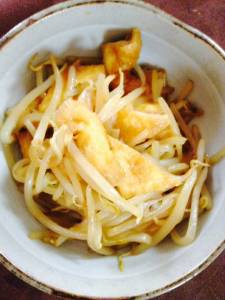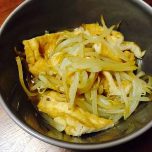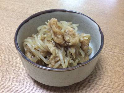もやしはひげ根を除く。油揚げは一口大の三角形に切り、熱湯をかけて油抜きをする。