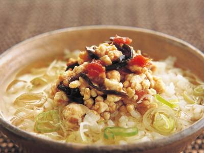 小口切りにしたねぎ適量を水にさらしておく。器にご飯茶わん1杯分を盛り、お茶漬けの具大さじ2強をのせる。ねぎの水けをきってのせて、アツアツのほうじ茶をヒタヒタになる程度注ぐ。好みで塩少々をふる。
