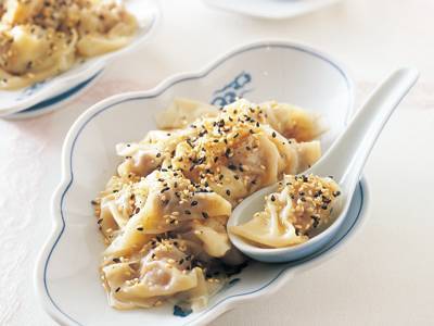 ツルンとした口当たりがたまらないゆでワンタン。白・黒ごまに、ごま油もかけて、ごまの香りたっぷり。しっかり味がついているので、さっぱりとだしじょうゆでいただきます。タネをつくるときに、白こしょうをきかせると、お店のような味に。