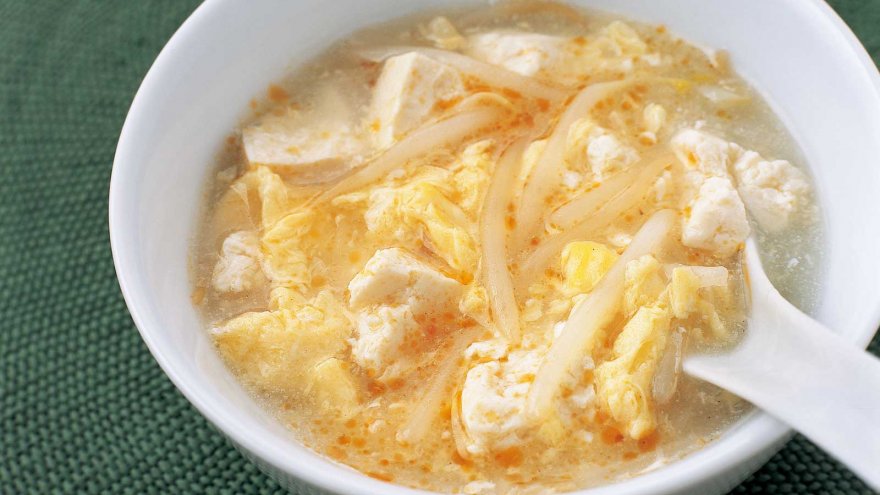 鍋に水カップ1+1/2、チキンスープの素を入れて中火にかけ、煮立ったら、もやしと豆腐を加え、塩・こしょう各少々で味を調える。