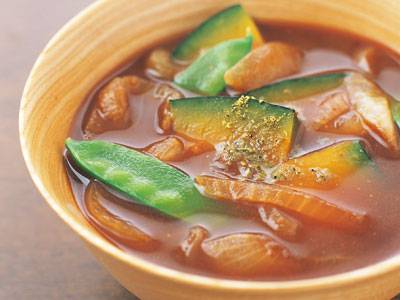 鍋にだしを入れて中火にかけ、煮立ったら、かぼちゃと炒めたまねぎを加え、赤みそを溶き入れて弱火で3分間煮る。