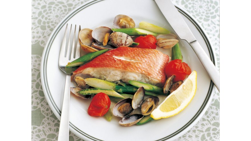 あさり,グリーンアスパラガス,白身魚(きんめだい)