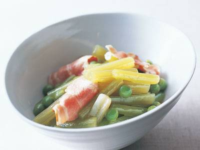 グリンピースはさやをむき、塩少々を入れた熱湯でサッとゆで、ざるに上げる。ベーコンは4~5cm長さに切る。