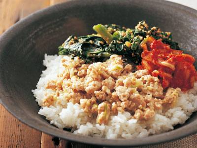 器に、ご飯、塩そぼろ2、白菜キムチをのせる。よく混ぜて食べる。