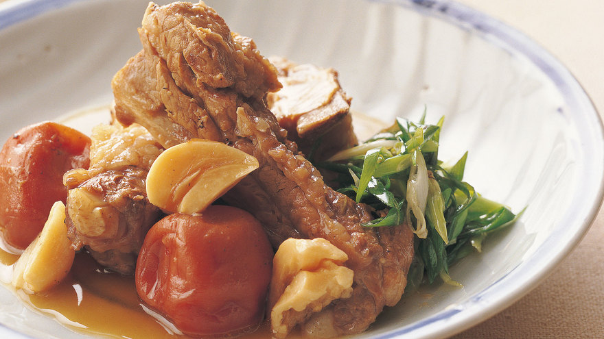鍋に湯をきったスペアリブ、にんにく、【A】を入れて、強火にかける(梅干しを上にのせて煮るだけ)。煮立ったら弱めの中火にして、ふたをして45分間ほど煮る。