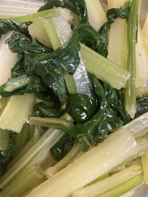 セロリ2本は5cm長さの棒状に切り、サッと塩ゆでしてざるに上げる。熱いうちに1のボウルに入れてあえる。