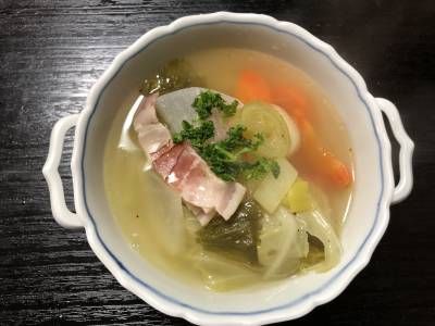 - *水1.2リットルに干し貝柱4~5コをほぐし入れる。家を出るときに用意していく。