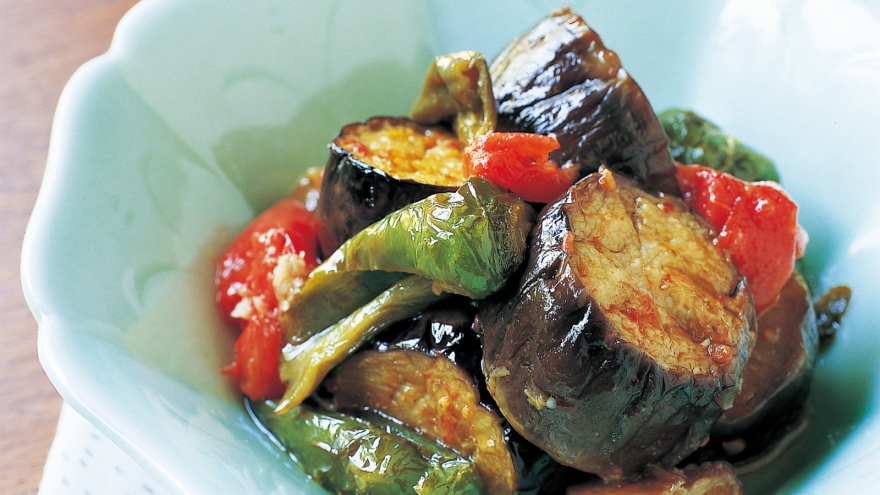 油と相性のよいなすを、トマトや万願寺とうがらしなどの夏野菜と炒め煮にした手軽な洋風のおばんざい。