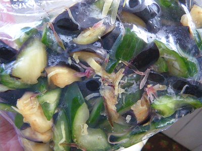 きゅうりは縦半分に切り、スプーンで種を除いて1cm幅の斜め切りにする。みょうが、しょうがを合わせ、塩小さじ1をふり、約20分間おいて、洗って汁けをギュッと絞る。