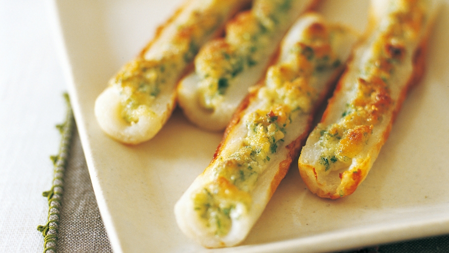 2のチーズマヨをぬった側を上にしてオーブントースターの受け皿に並べ、こんがりと焼き色がつくまで3~5分間焼く。
