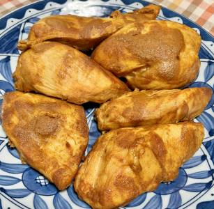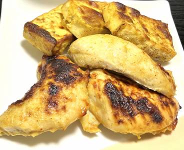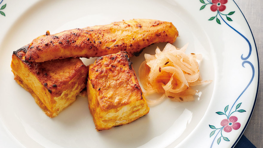 タンドリーチキンのベースにパニールという四角いチーズを漬けて焼くインドの料理を、豆腐で再現。ご飯によく合うおかずです。