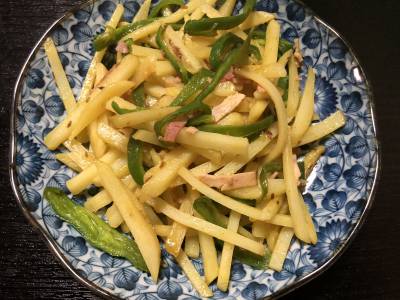 フライパンにサラダ油大さじ2を熱し、クミンシードを軽く炒め、じゃがいもを加えてさらに炒める。透き通ってきたらピーマンとハムを加えて炒め、塩小さじ1/2、カレー粉を加える。しょうゆ小さじ1+1/2を加えて味を調え、仕上げる。