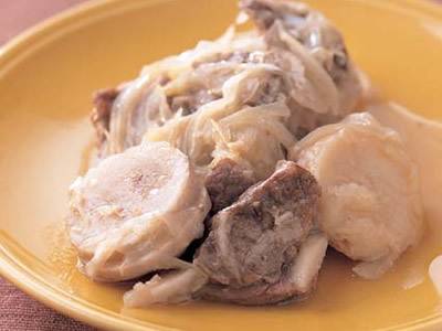 厚手のなべに里芋、牛肉、にんにく、塩小さじ2/3、こしょう少々、たまねぎの順に、2段に重ねていく。