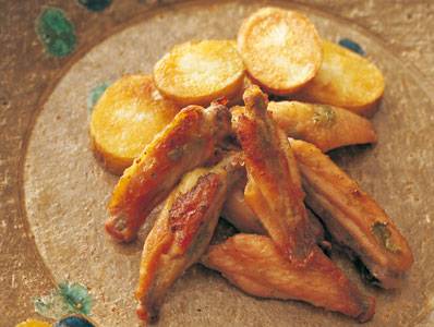 オーブンの天板にオリーブ油適量をぬり広げ、1の鶏スペアリブ、2のじゃがいもを並べ、200℃に温めたオーブンで約15分間焼く。