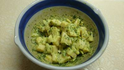 再びラップをして電子レンジに1分30秒間かけ、取り出したらくるみを加えてよく混ぜ合わせる。混ぜたときにしっかりと形が残るぐらいの堅さが目安。