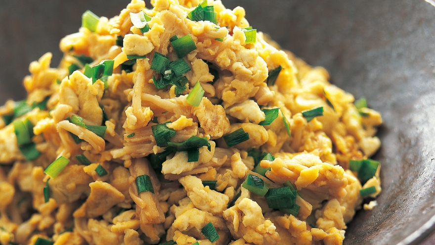 32のえのきだけを戻し入れていため合わせ、【A】を加える。溶き卵を回し入れてかき混ぜ、にらを散らす。