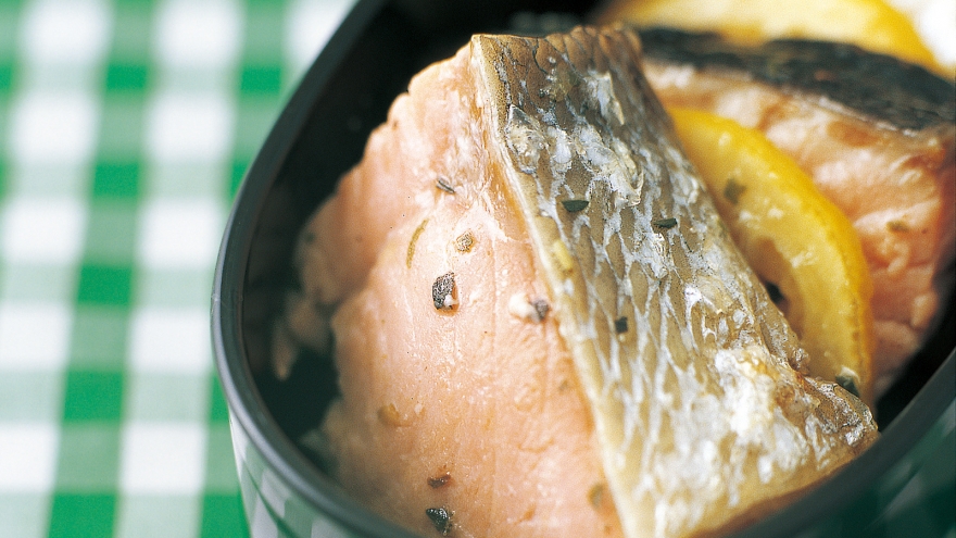 耐熱皿に「さけのハーブマリネ」を並べ、ラップをふんわりとかけ、電子レンジ(600W)に3分~3分30秒間、さけの色が変わるまでかける。ラップをかけたまま、2~3分間おいて余熱で火を通す。