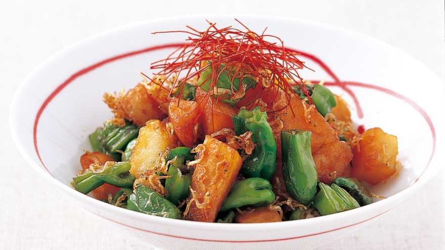 フライパンにサラダ油大さじ1を熱し、じゃがいもをきつね色に焼く。ちりめんじゃこを加え、カリッとしたらサラダ油大さじ1を足し、ししとうがらしも加えていため合わせる。