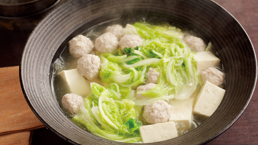 柔らかくクタッとした白菜の葉がおいしい中国風のスープ煮。ポイントは、たっぷりの水分を含ませたフワフワの肉だんごです。