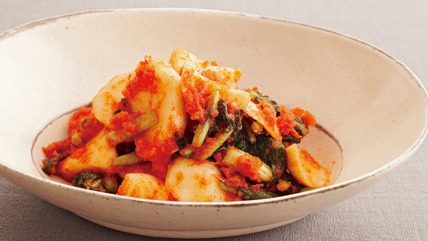 漬けたてのキムチは手で裂いて、クルッと丸めて食べるのがおすすめ。軸と葉の両方を味わうことができ、包丁で切ったときとはまた違う食感が楽しめます。ぜひ試してみてください!