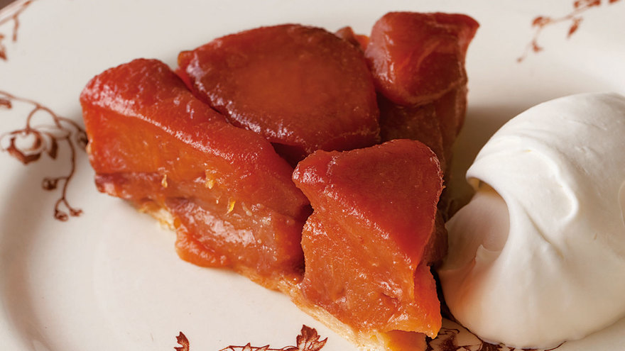 フランスのお菓子です。甘酸っぱく煮えたりんごの上にパイ生地をのせて焼き、お皿の上にひっくり返していただきます。好みで甘くないホイップクリームを添えてどうぞ。