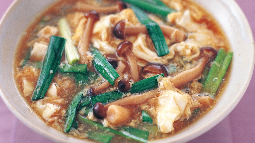 食物繊維が豊富なきのこに、血行を促す効果のある硫化アリルを含んだにらを入れたうどん。かたくり粉でとろみをつけると冷めにくくなります。