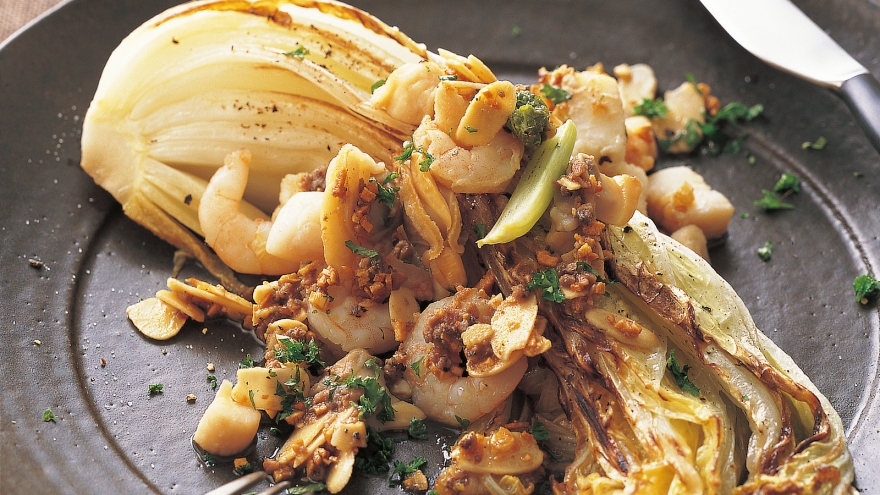 アンチョビとアーモンドが決め手のソースをかければ、おしゃれな一品に。大きく裂いた白菜をどんと焼きつけて甘みを凝縮させます。