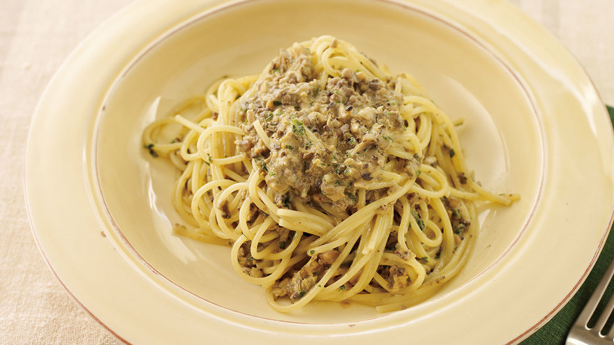 マッシュルームとかきのみじん切りをいため水分を蒸発させたクリームソース“デュクセル”。このクリームソースをつかったパスタです。
