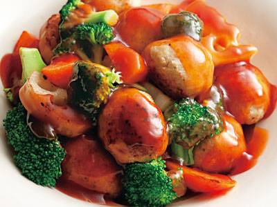 鶏肉のだしが出ているゆで汁を使う、ひと味アップの甘酢あん。肉だんごは、多めの油で揚げ焼きにします。
