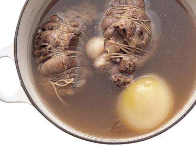 味をみて塩味を調え、火を止める。必ずふたをしたまま荒熱が取れるまでおく。さらに一晩冷蔵庫におくと脂が固まるので、煮汁をこしてスープに使う。