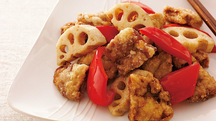揚げ油を180℃に熱し、れんこんの水けをふいて入れ、薄く色づくまで揚げる。油をきり、軽く塩をふる。続けてパプリカもサッと揚げ、油をきって軽く塩をふる。