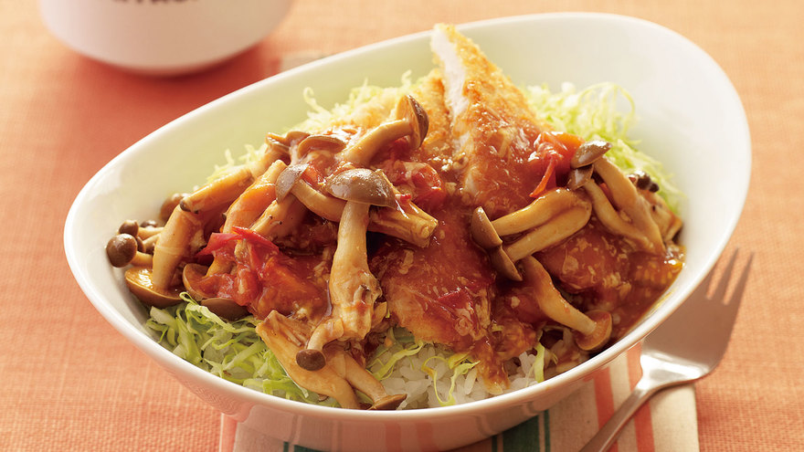 カレー味が食欲をそそる、ガッツリ丼。カツは手間のかかる料理に見えますが、ささ身を薄くたたいて揚げるだけ!