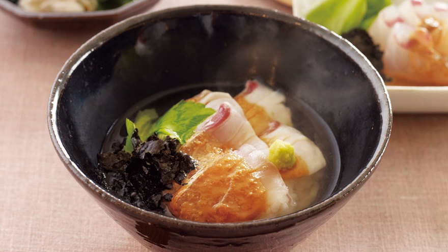 丼にご飯を盛り、たいに1をからめて好みの量をのせる。みつば、のり、わさびを添え、アツアツのだしを注ぐ。
