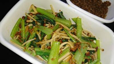 「おかかじょうゆ」をふりかけて、あえ物も減塩でどうぞ。サッとできます。