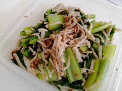 えのきだけは根元を切り落とし、長さを半分に切って、熱湯でサッとゆで、ざるにあけて水けをきる。ともにボウルに入れ、おかかじょうゆであえる。