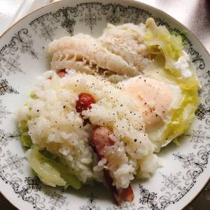 キャベツ、たら、ベーコンを蒸し焼きにし。その蒸し汁でご飯を煮て、洋風おじやを作ります。素材のうまみを存分に生かして、調味料を多用せず、やさしい味に仕上げました。